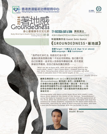 Choreographer and dance artist Asahi Bruce will create a solo dance piece based on the theme of the festival, "Groundedness", using the body to respond to and connect with the exploration of the mind. After the performance, HKEXAT's therapist will lead the audience to create aesthetic response to the dance with multi-art modalities, searching for what is most precious to them, and have a post-performance exchange with the performer in arts.